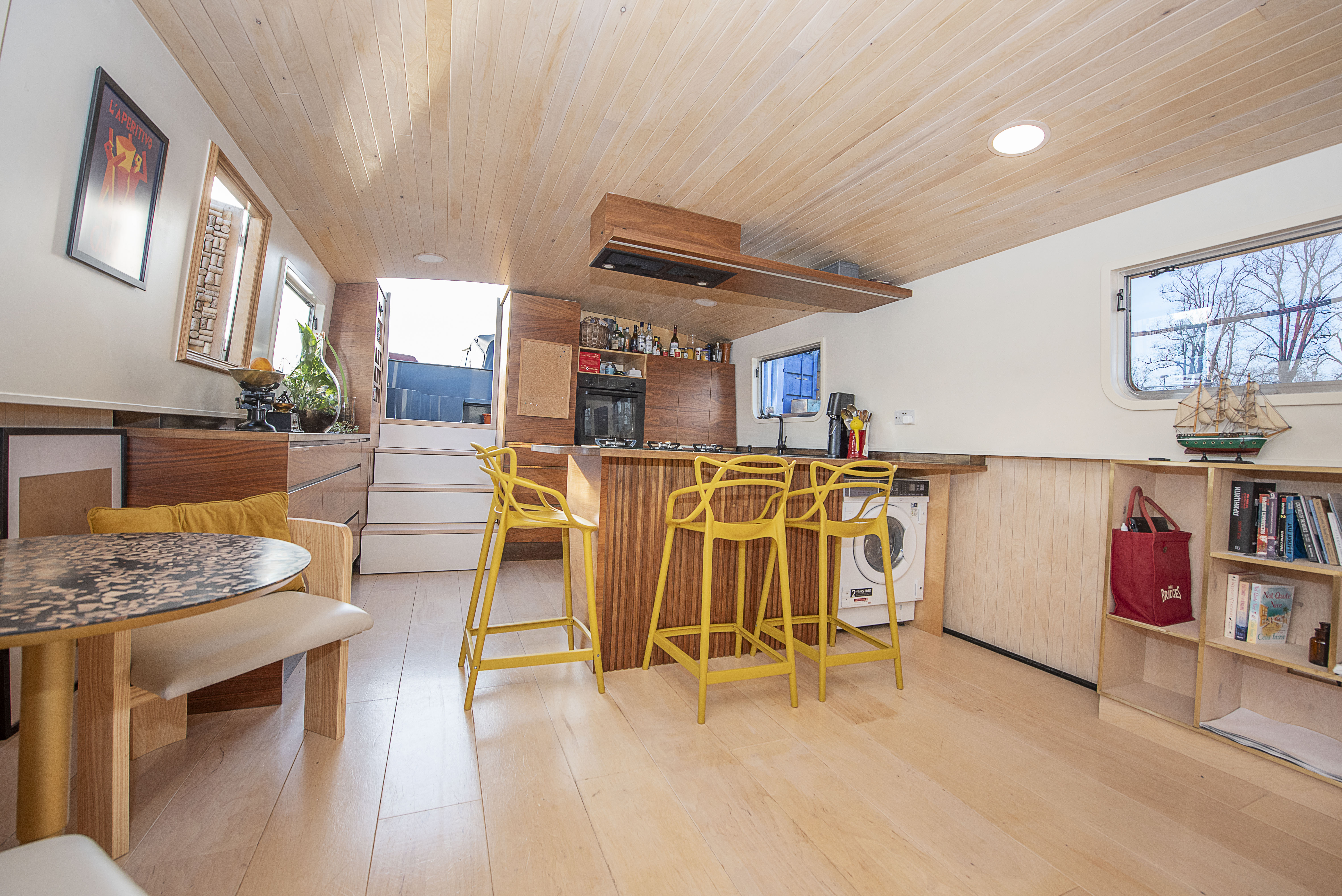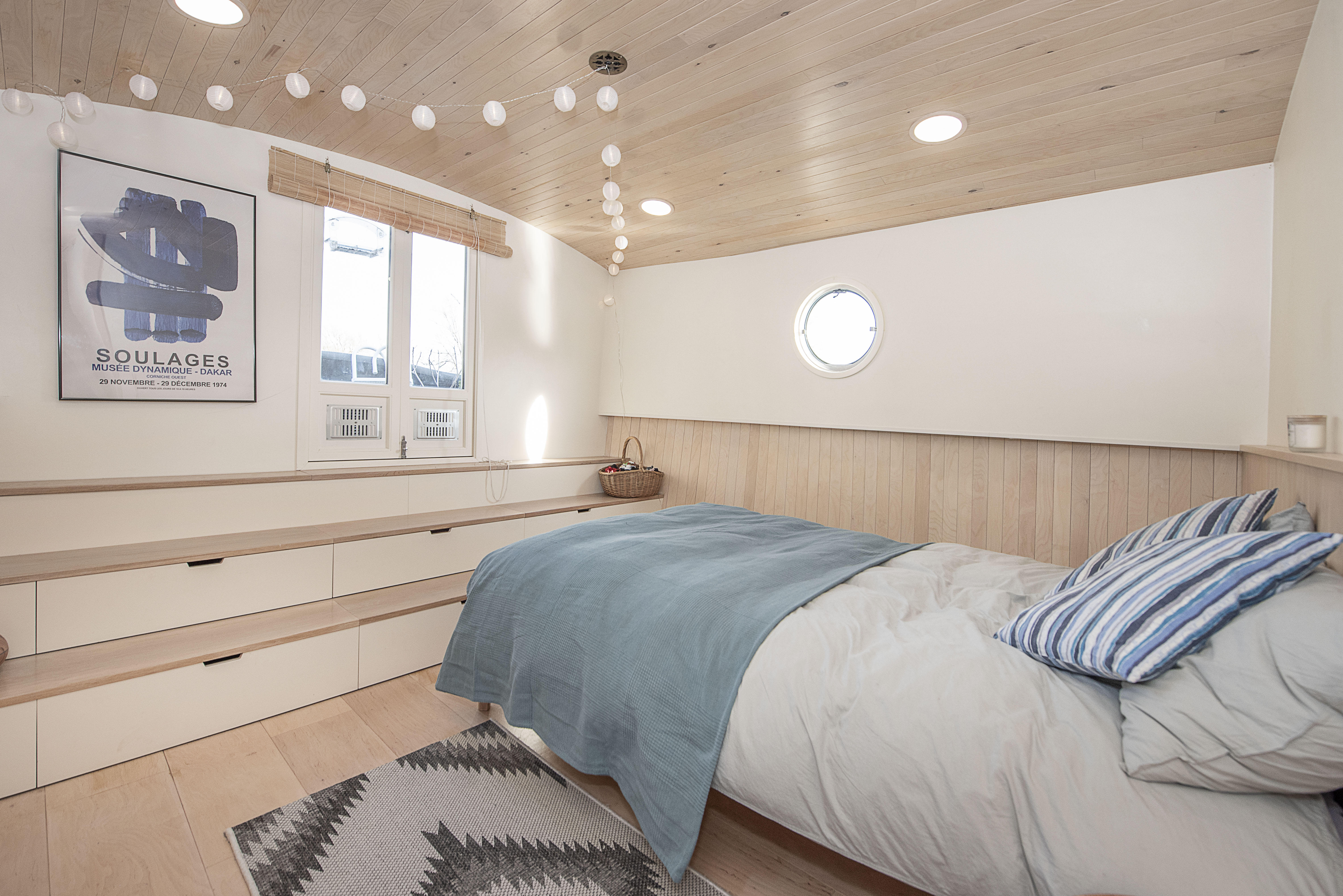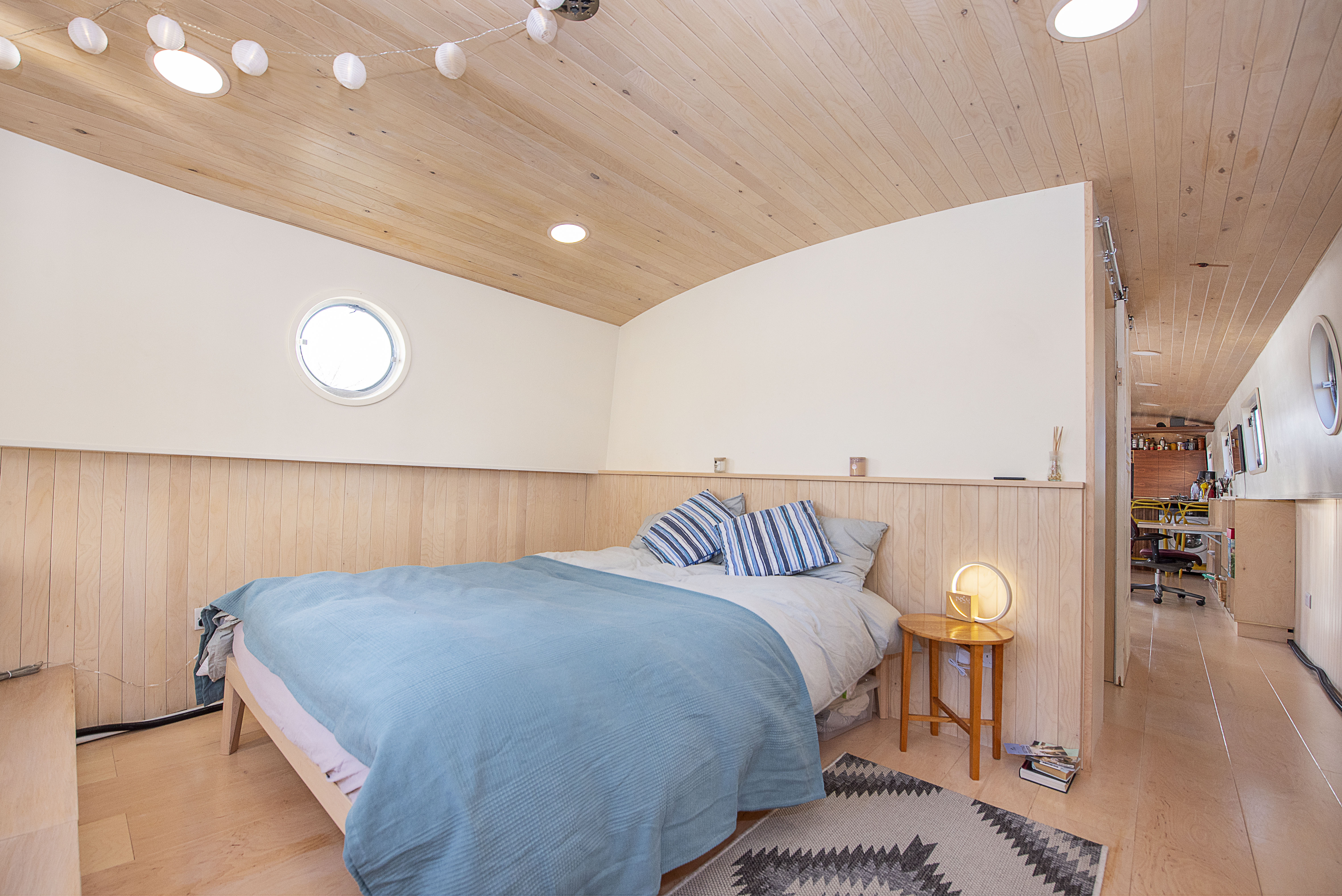 The bedroom features ample storage, including bespoke steps with built-in storage drawers, and offers the flexibility to add a second bedroom, should the new owner require more space. The double-glazed bespoke bow doors allow for an abundance of natural light, enhancing the warmth of the bespoke birch cladding under the gunnels and classic tongue-and-groove birch ceiling and flooring.