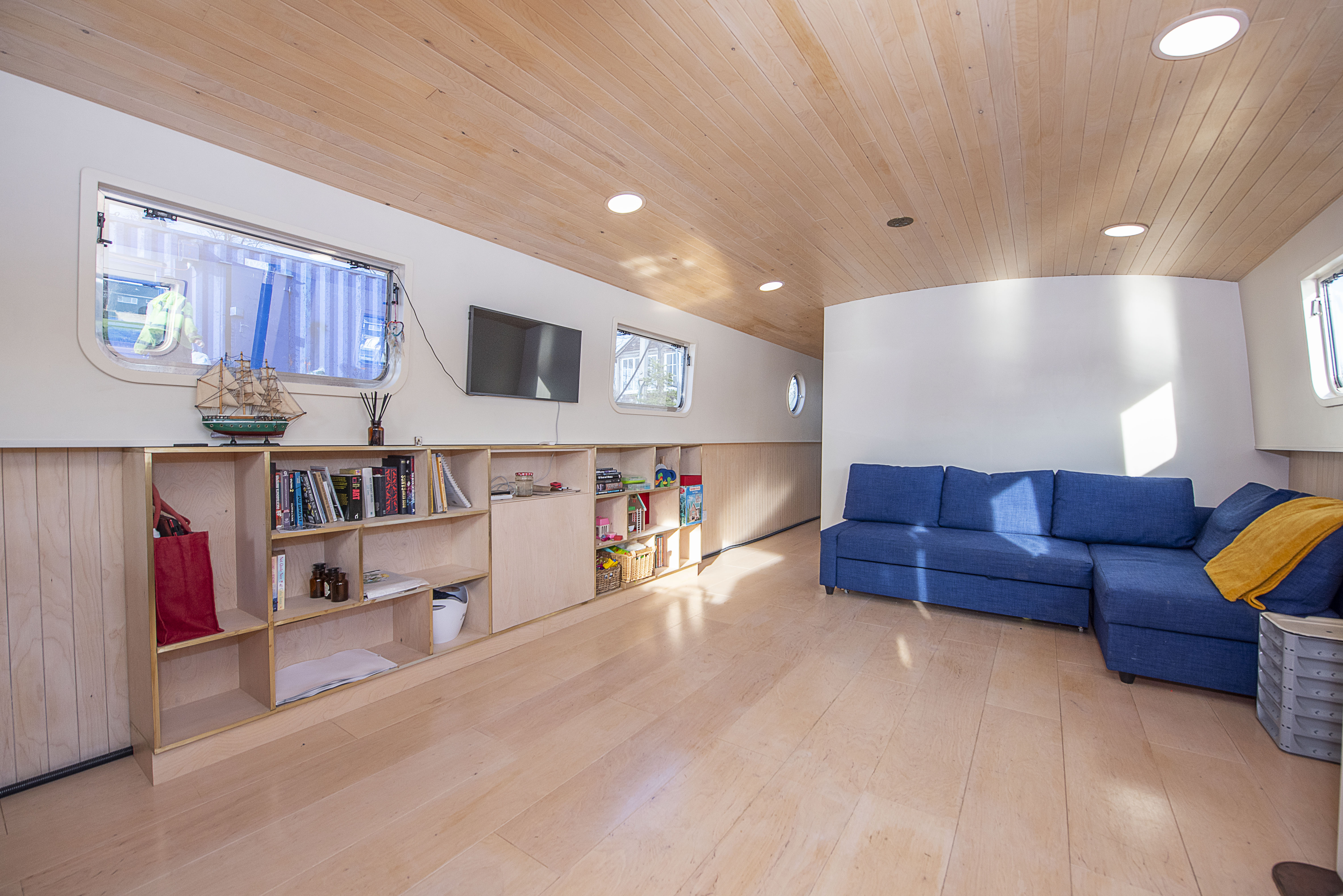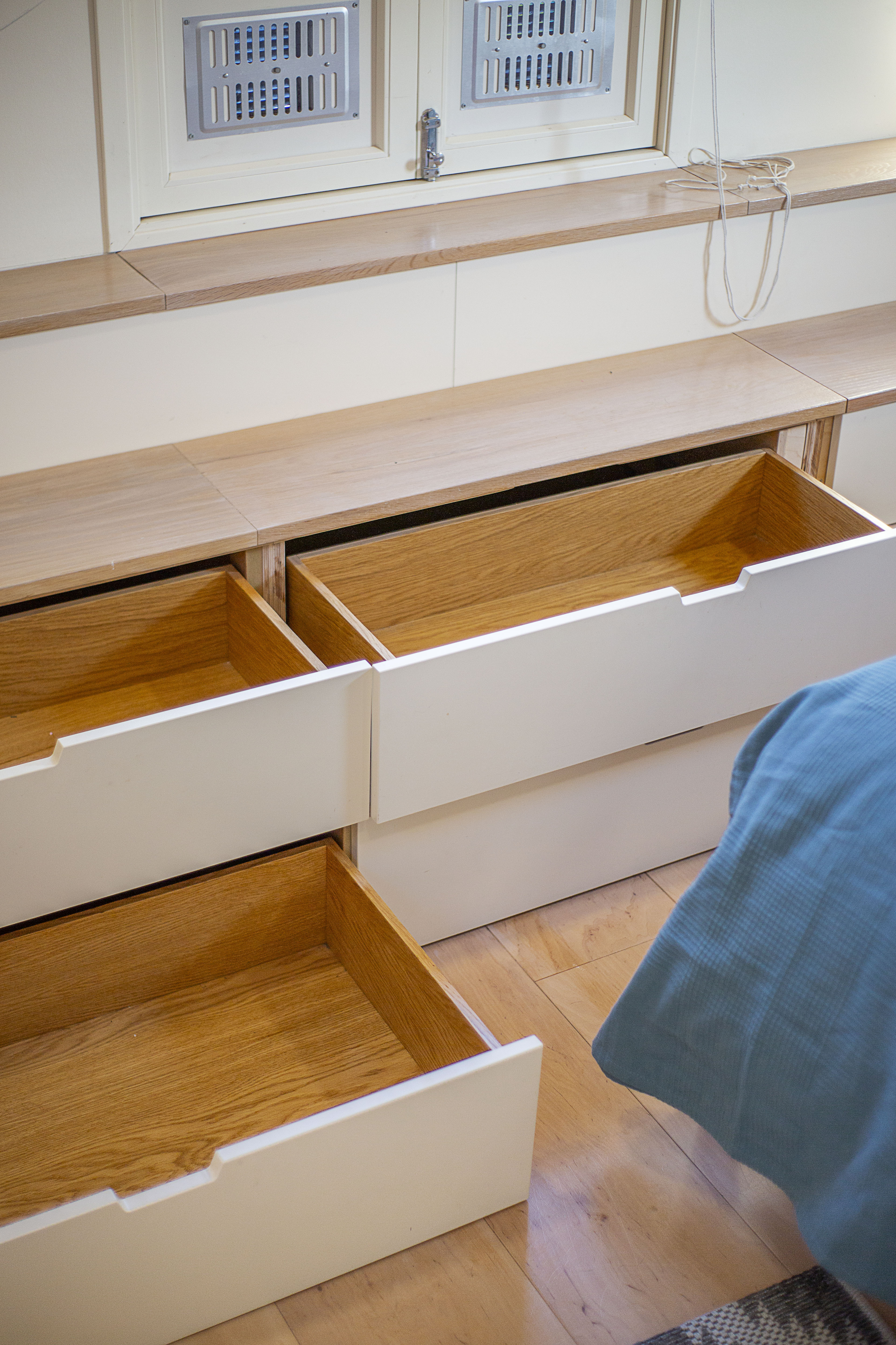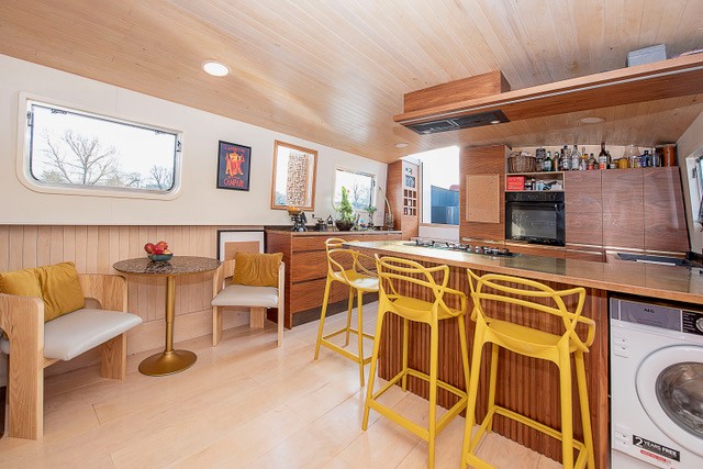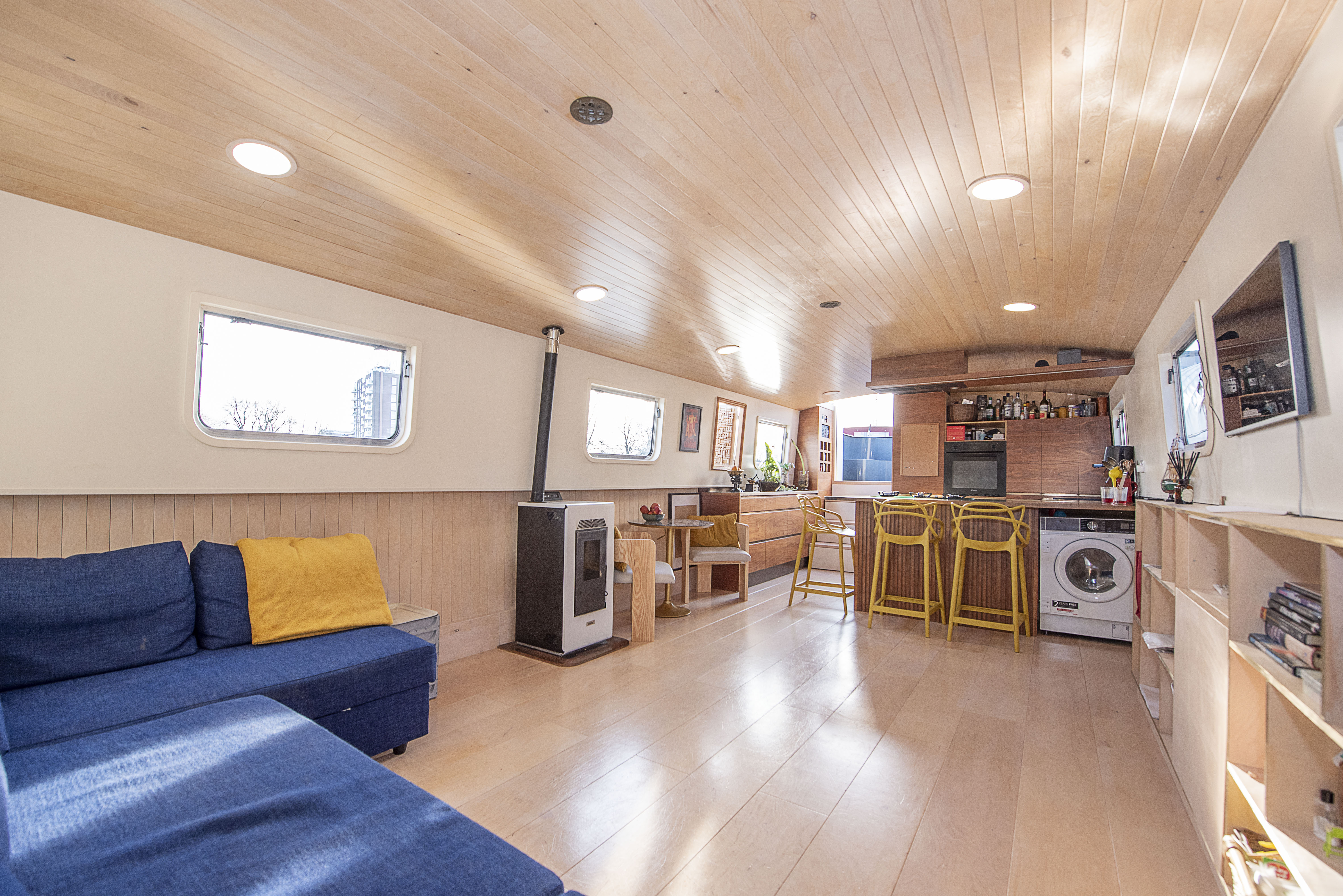 The bedroom features ample storage, including bespoke steps with built-in storage drawers, and offers the flexibility to add a second bedroom, should the new owner require more space. The double-glazed bespoke bow doors allow for an abundance of natural light, enhancing the warmth of the bespoke birch cladding under the gunnels and classic tongue-and-groove birch ceiling and flooring.