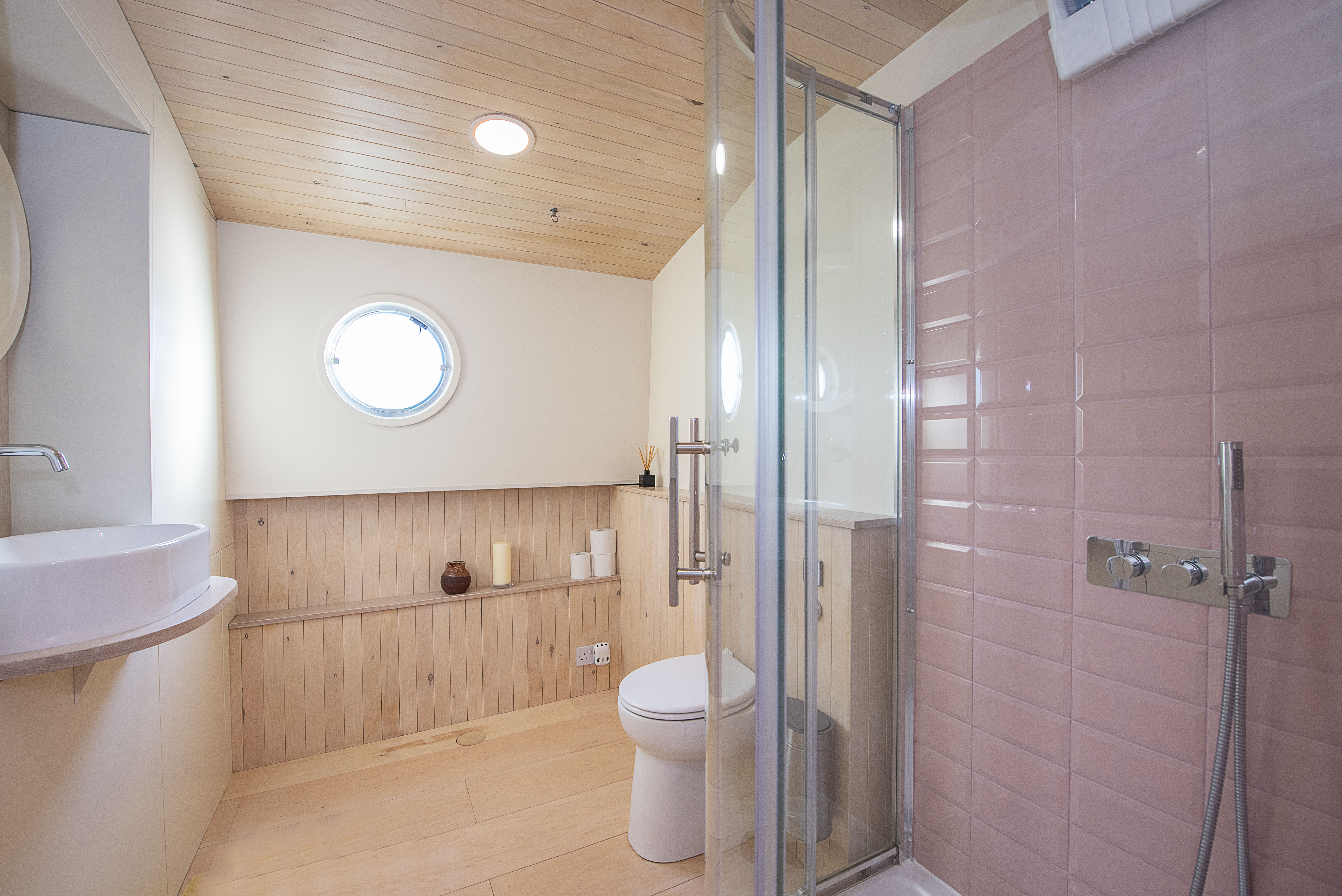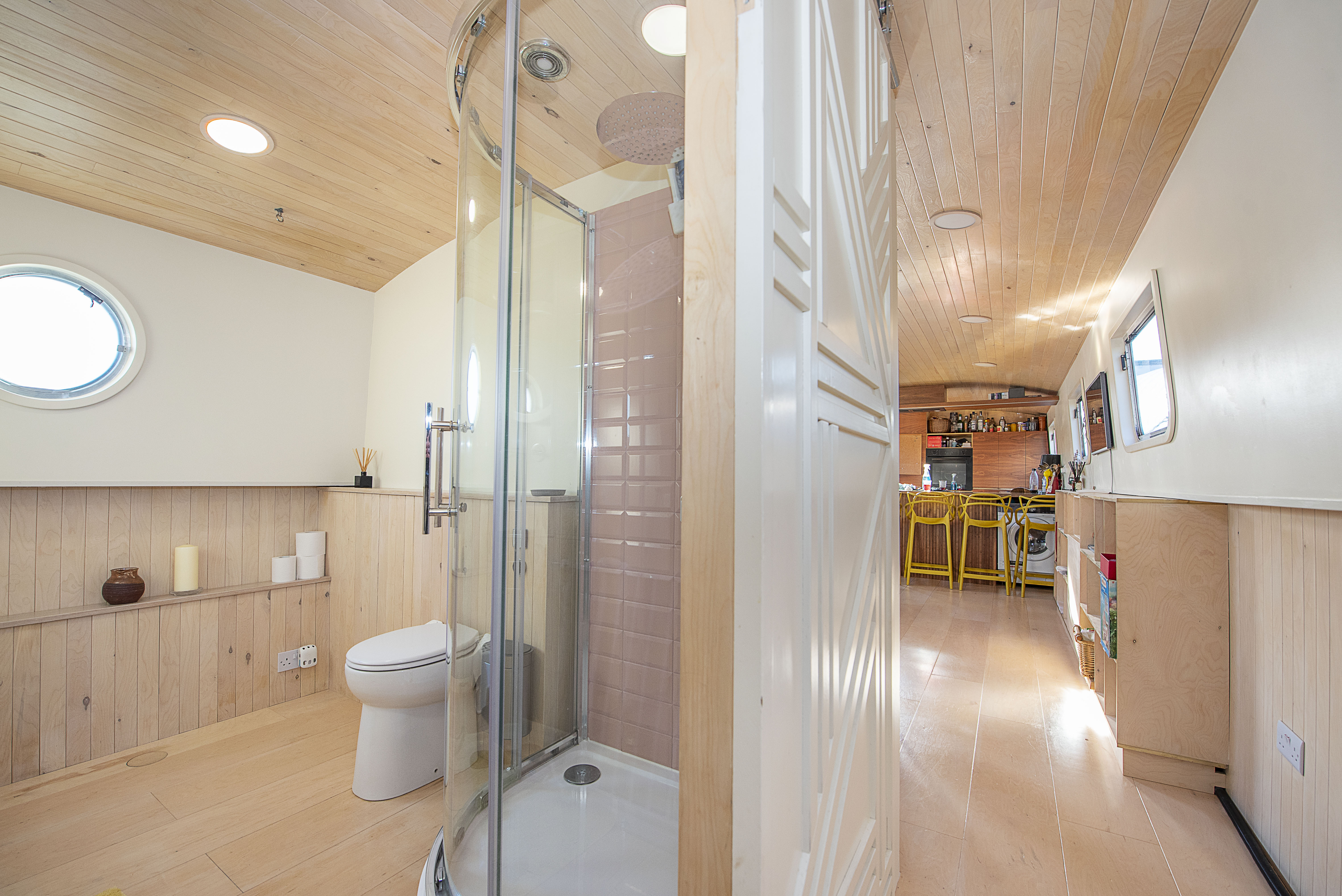 Bathroom: Bespoke sliding door, built-in storage, shower, 12V Vetus pump-out toilet, space for a bath if required