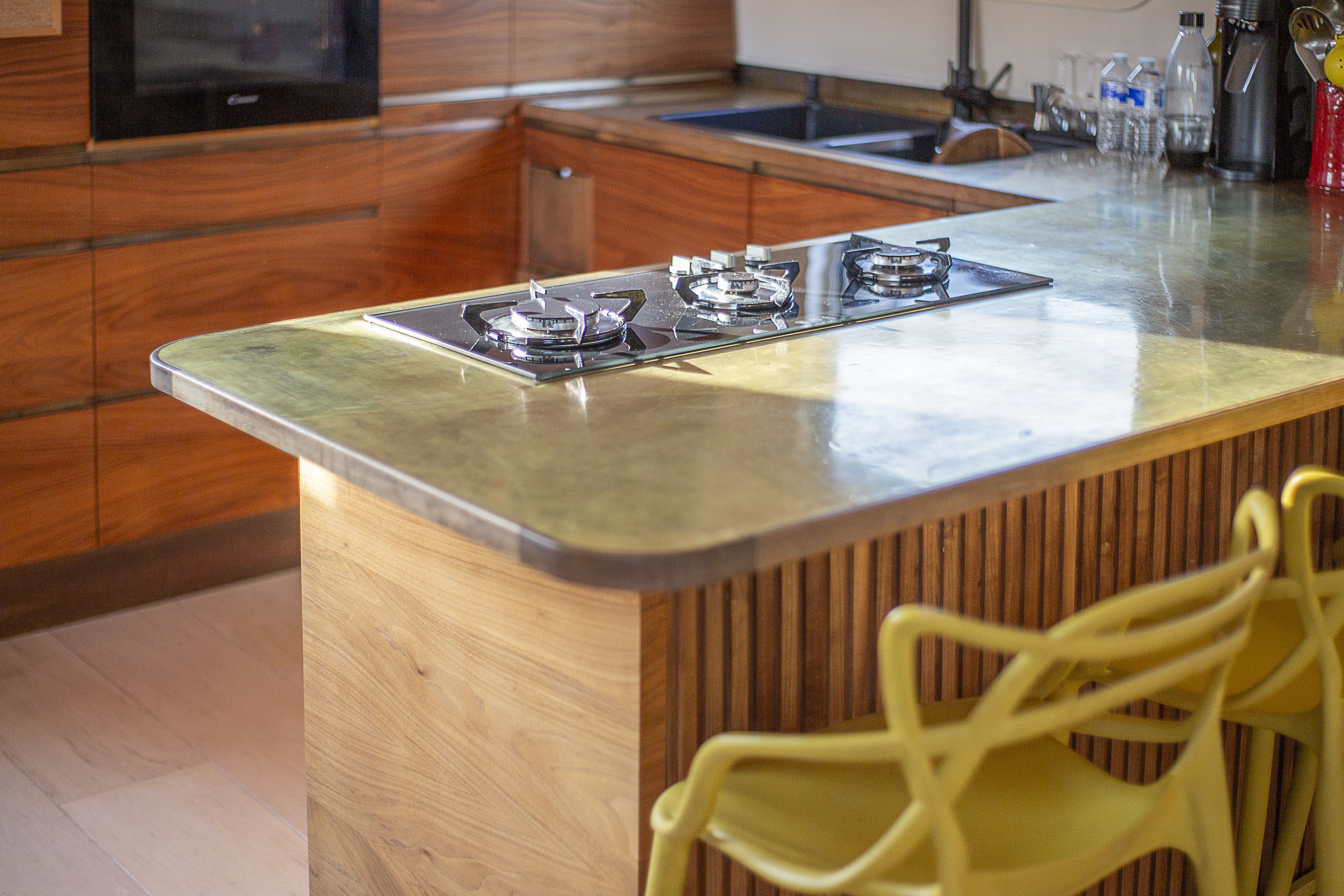 Kitchen: Bespoke brass surfaces, walnut veneer-finished cabinets, integrated fridge & freezer, built-in washing machine, drinking water filter, double sink, large island (seats 4), oven, 3-burner hob, extractor fan