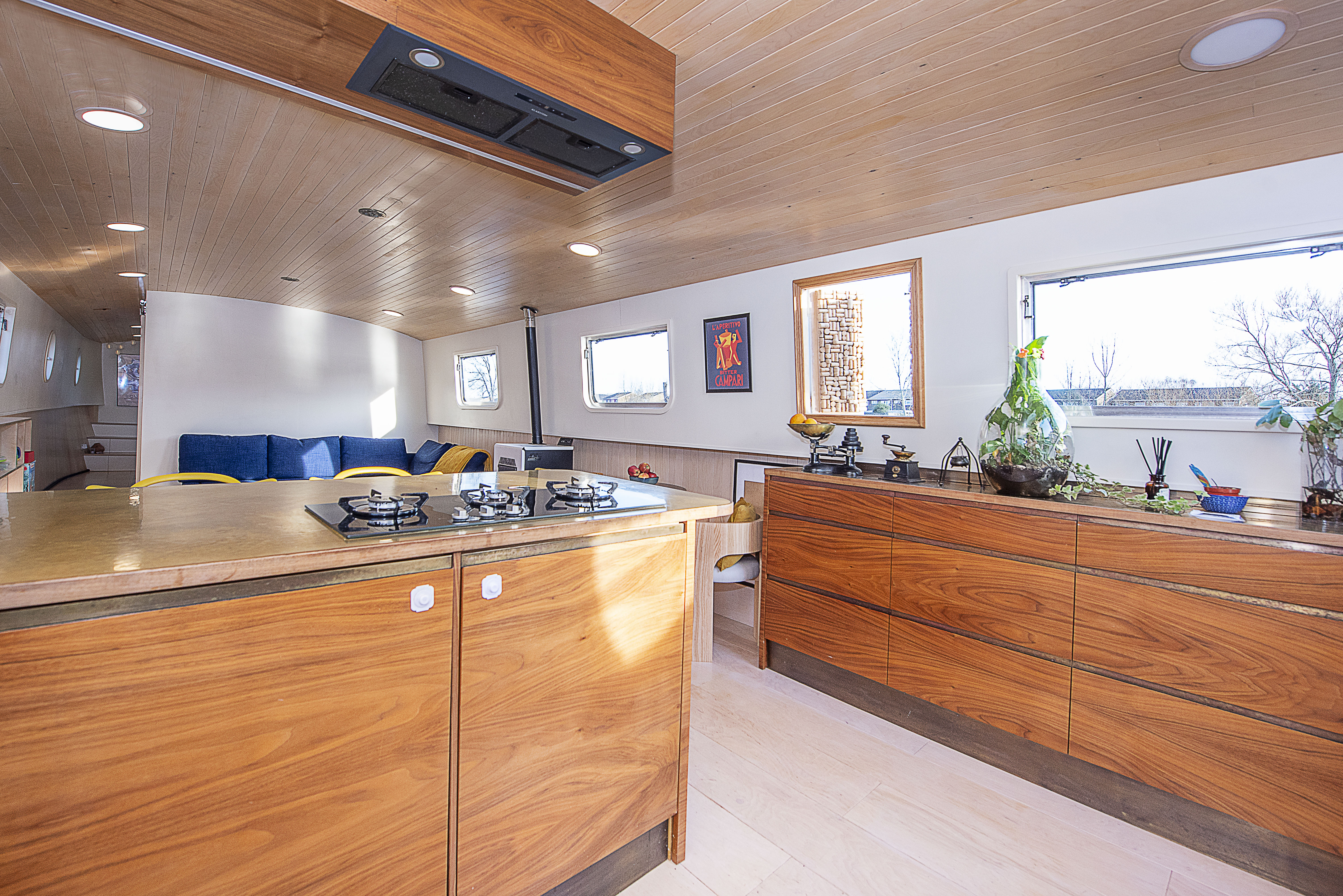 The heart of the boat is its beautifully designed bespoke kitchen, featuring brass work surfaces, walnut veneer-finished cabinets, and top-of-the-line appliances. The space is complete with an integrated fridge, separate integrated freezer, built-in washing machine, double sink with a drinking water filter, and a large island, ideal for both food preparation and dining.